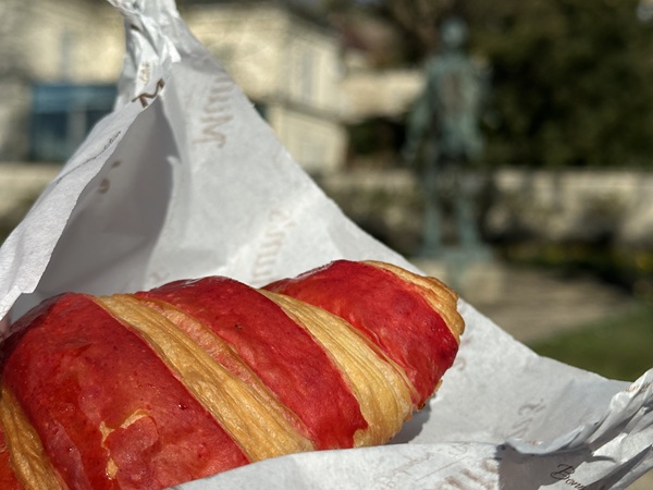 和R在導遊推薦的奧維小鎮麵包店「Mum's」買了一個覆盆子可頌,坐在梵谷公園(Parc Vincent Van Gogh)前的長椅上吃,欣賞樹上盛開的白花,真是慵懶愜意。
