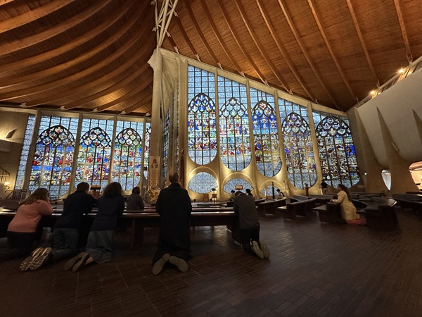傍晚六點,以為教堂關門了,卻有幾位穿長袍的人開鎖,民眾魚貫而入。我遲疑,R示意我跟著進去,聖女貞德教堂內部好漂亮!挑高的彩色玻璃,環狀的座位前,跪在地上禱告的人,讓人感受神聖氣息。