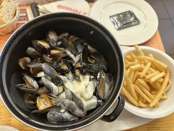 R要我憑直覺選一間,我選擇「從眾」,跟同團的年長學者三人組走進「Il Parasole」。三人組的其中一名老先生會講法語,有他們在較安心。和R合點一份奶油白醬淡菜配薯條,等候上菜時,我們邊喝水邊啃麵包。
