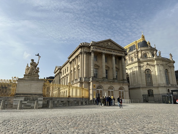 下午參觀金碧輝煌的凡爾賽宮(Château de Versailles),附中文解說導覽。我的穿著跟解說員相似,上衣、裙子、褲襪,看來今天也穿對了,咖啡色系跟凡爾賽宮相襯。