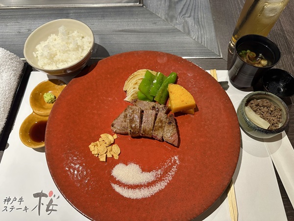 逛完三個館,步行去「神戸牛ステーキ 桜」吃神戶牛排。我預約十一點四十五分,回想起來真是明智,不會太早也不會太晚,算得剛剛好!三宮車站附近那麼多間,為何挑這一間?我的答案是:觀光路線比較順。
