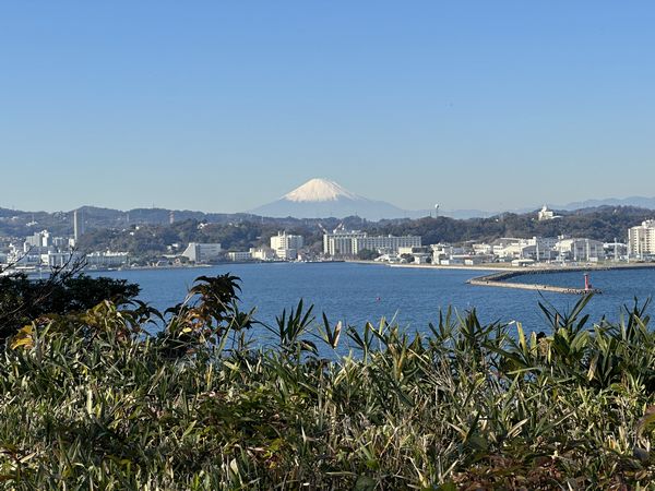 陽光普照,照得水面波光粼粼,適合登島遊船的好天氣。上午十點半,幸運趕上一班開往「猿島」的船,船上載滿遊客,或坐或站,行駛十分鐘即到達目的地。一登上猿島,就看到可愛的艦娘人形立牌,可惜當年沒玩,一個角色都認不得。往遠處看,沙灘與海的彼端,富士山白皚皚的山頂清晰可見。