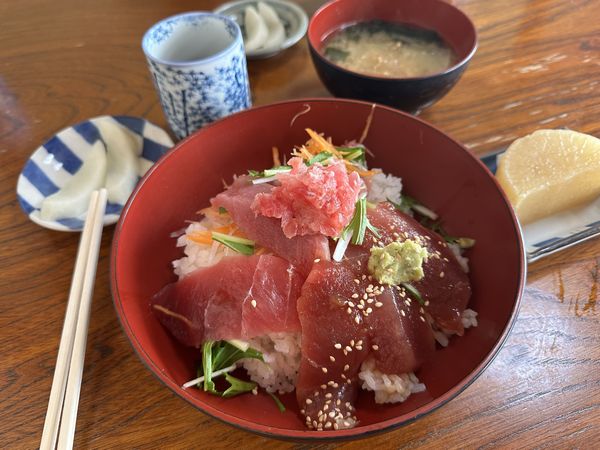 我點了「まぐろ丼」,T說來都來了,要我務必嘗試。鮮美的鮪魚生魚片鋪在飯上,附一碟小菜,一碟滷蘿蔔,一碗味噌湯,看似平凡,卻吃得出對料理的用心,吃得乾乾淨淨、整碗見底,就是最實在的回報。