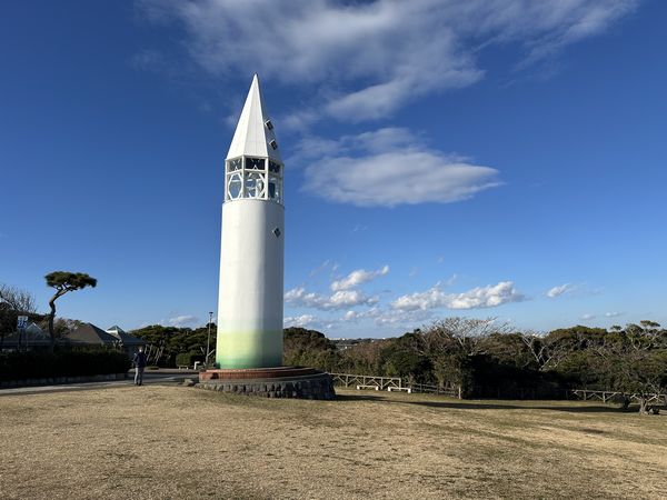 我們走到「馬の背洞門」,上去展望台,又走到城島公園,與地標「安房崎燈塔」合照。它的設計靈感來自三浦特產白蘿蔔,正是午餐吃到的食物,把蘿蔔倒過來看,白白尖尖的身形,底下點綴綠綠的葉子,燈塔設置在廣場上,亮眼而不顯突兀。