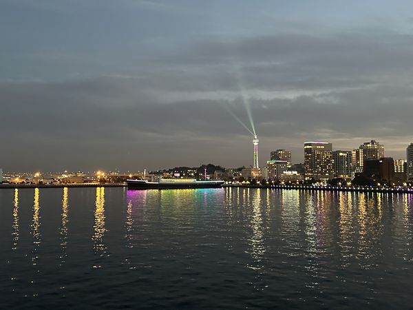 傍晚五點,「ヨルノヨ」點起燈來,照亮橫濱港。看完夜景,走四公里,回到橫濱車站,吃茶泡飯。