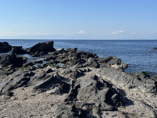 飯後散步望海,天氣也很好,看得到富士山。海岸岩石地質奇特,有「火炎構造」,也有「逆斷層」,據說大正年間,關東大地震時,城島隆起了約一點六米。眼前景色讓我聯想到台東的富岡地質公園,俗稱小野柳,有奇形怪狀的豆腐岩、蕈狀岩等等。不過嚴格說起來,應是不能比擬,兩者各有各的特色。