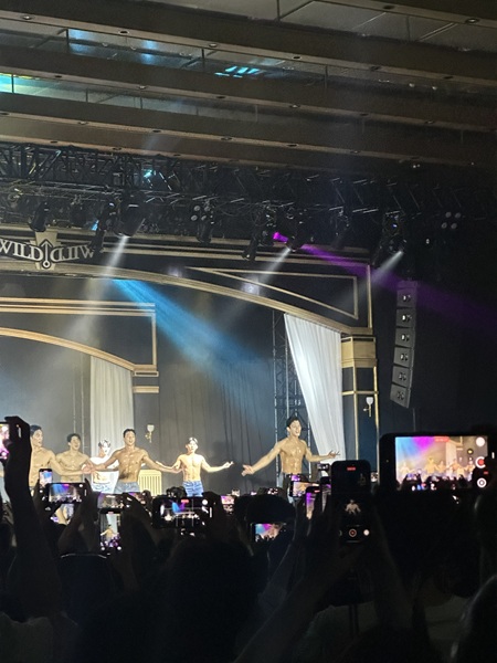 儘管是男女不拘的場次,來看猛男秀的仍是女多於男。有的大膽「示愛」,貼著猛男海報拍照,有的忙著補妝,期待獲得猛男青睞。坐在我前面、綁著雙邊公主頭的長捲髮女子穿著露背黑色洋裝,很有女主角氣場。她從頭到尾坐得直挺挺,我也只好保持抬頭挺胸,否則視線會被擋到。